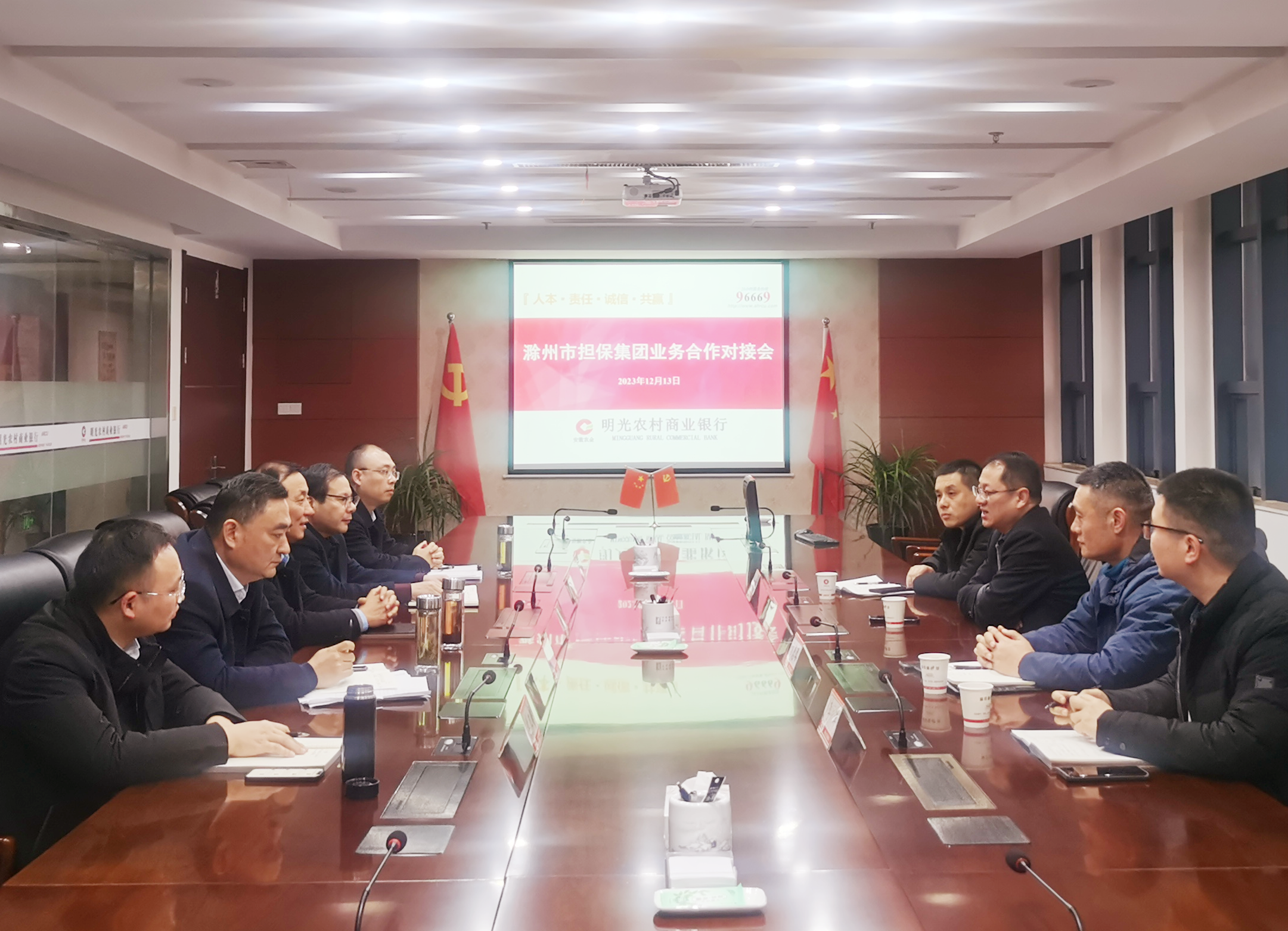12月13日,市擔(dān)保集團黨委委員、副總經(jīng)理張健帶隊前往明光農(nóng)商行開展業(yè)務(wù)交流,明光農(nóng)商行董事長任路明及相關(guān)領(lǐng)導(dǎo)參加座談。